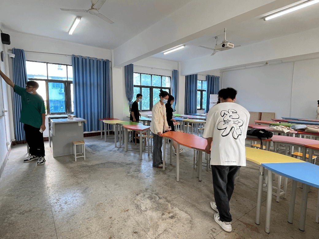 十二点半我们在教院门口集合,进行了点名,随后一声令下,大家便按照之前的安排浩浩荡荡的进入教院,开始了我们的第一项社会实践—打扫教室,整理课桌。