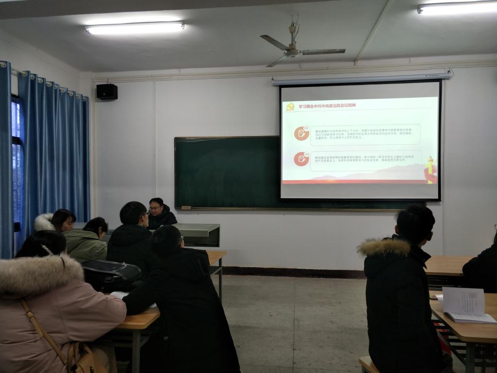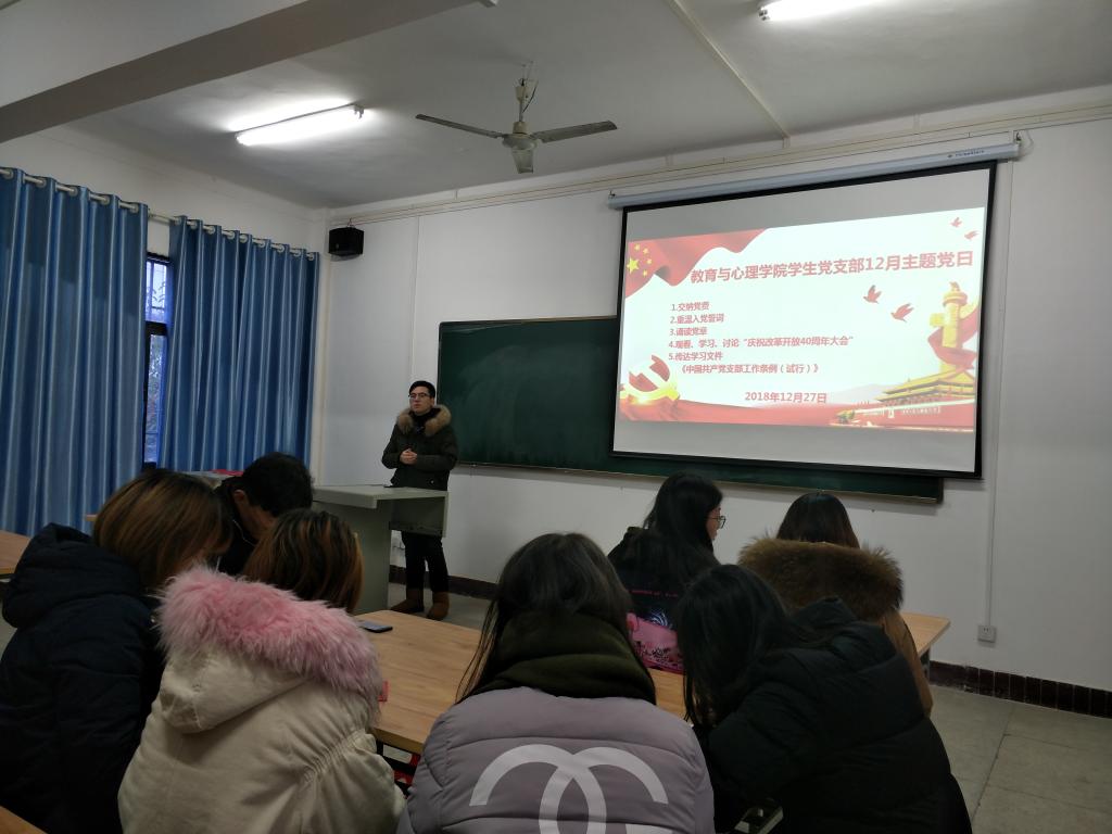2018年12月27日下午14:00,william英国中文学生党支部在教育楼202教室开展了12月主题党日暨书记上党课。活动由辅导员袁野主持,党总支副书记张东主讲,参与人员包括辅导员华丽和全体在校学生党员。