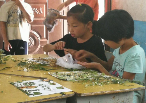 一切准备就绪后,我们即将开始我们的实践活动了,第一天实践小分队把学生进行了一个分层,分为低年级、高年级两个层次。同时,实践队队伍也进行了一个分工,一人主讲,其他辅助一对一教学。手工课结束,趣味数学教学的课程井然有序开展。移火柴棒小游戏、找规律填数字都在启发着小学生们积极思考,大胆发言。在当中我们发现了一些对数学特别有兴趣的学生,也看到他们对趣味难题的执着。最后是英语口语课,带领小学生认识英文字母,唱字母歌,完成字母大小写连线有奖比赛。