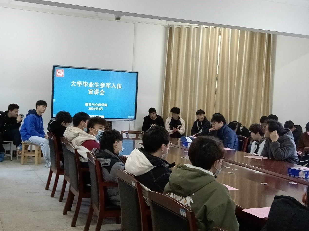 为响应国家号召,促进国防和军队现代化建设,我院于2021年3月11日下午在教育楼403组织召开了大学生参军入伍宣讲会。会议由辅导员袁野老师主持,学院全体男生参与其中。