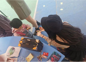 有趣的小游戏还吸引来了可爱的小朋友,下图为小朋友给工作人员送糖果。