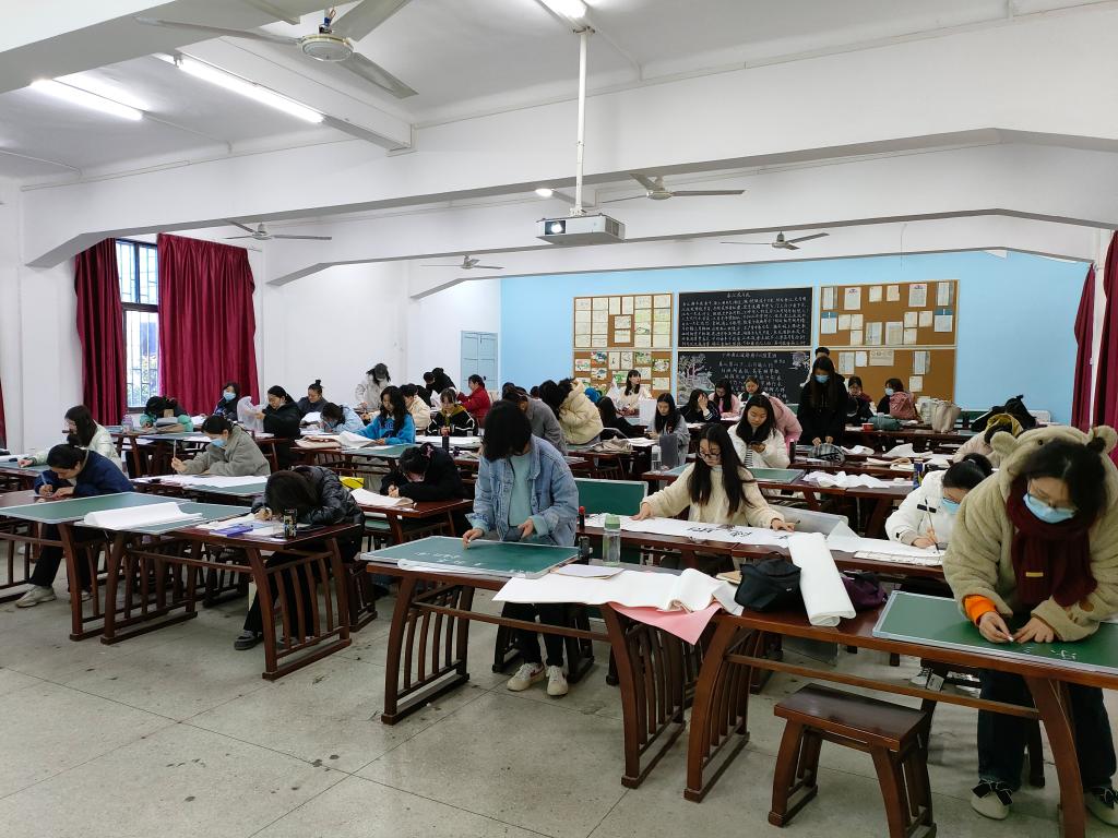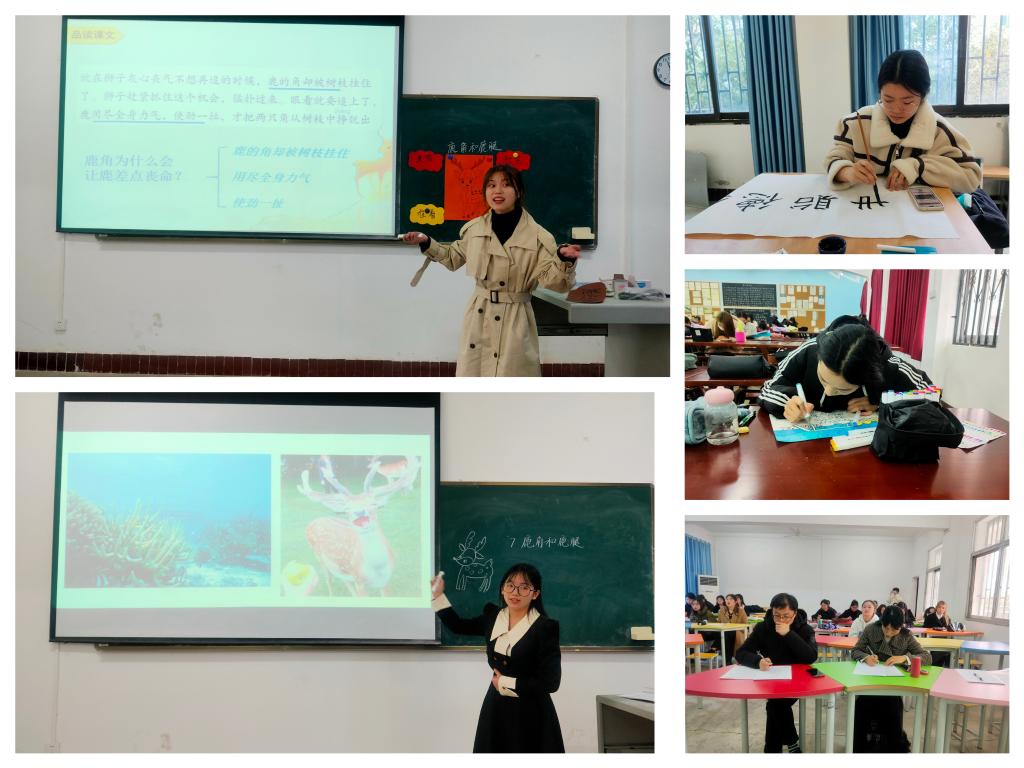 在本学期初学院“师范生专业技能展示月”中脱颖而出的大二、大三年级共219名学生参加了本次竞赛。比赛现场,参赛选手们根据比赛规则,紧张有序地投入到竞赛展示环节,或精彩教学讲解、或认真写字作画、或专注制作课件;评委老师们也带着对参赛学生的鼓励和期许,根据评分规则进行着公平细致的评分和竞赛结束后的点评工作。经过紧张、激烈的角逐,39名学生获得一等奖、63名学生获得二等奖、95名学生获得三等奖。获得一、二等奖的部分小学教育专业的学生将参加统一培训,备战第十届湖北省小学教育专业学生技能竞赛。