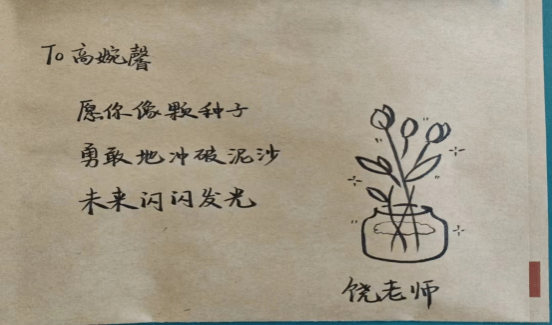 菲同学在实习中有着极高的工作热情和责任心,不仅表现在对自身专业刻苦钻研,追求精益求精,而且体现在对学生的那份发自肺腑的关爱。在实习临近结束时,饶菲同学亲手为班上的每一位学生做了一份贺卡,卡上写下了对每位学生的离别寄语。六十七份寄语,字字真切却无一重复,这让学生以及家长都极为感动。