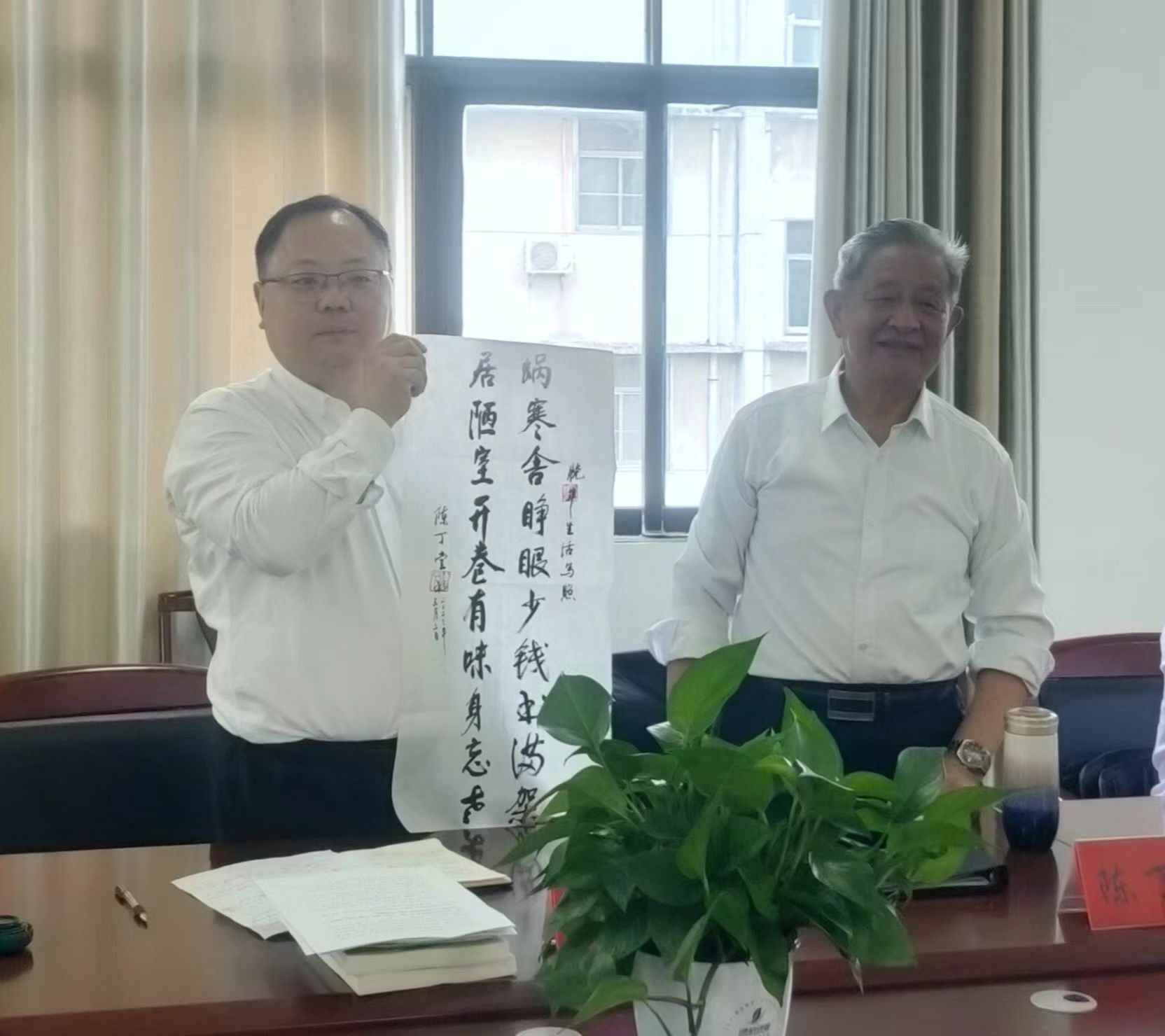 同学们被陈教授的精神所打动,积极地提问互动。如:该怎么对待调皮和不调皮的同学,该怎么对待学习成绩有差异的同学;如果一位同学在学习方面没有天赋,作为一位老师,该不该推荐他去做其他事等等。从各位同学的提问中,也能够感受到教院同学们对教育的热爱,以及对教师岗位的思考。陈教授充分肯定了大家的思考和热情,并根据自身经验,举出各种鲜活的例子为同学们答疑解惑。座谈会最后,陈教授还为同学们送上了他亲自书写的一幅字:窝寒舍睁眼少钱书满架,居陋室开卷有味身忘老。这幅字,既描述了他的晚年生活,更寄送了他对青年学子认真读书、踏实学习的衷心祝愿。此外,笔耕不辍的陈教授还为大家带来了他的两本著作:《我们怎样才能上好课》、《平凡人生-我的回忆录》。
