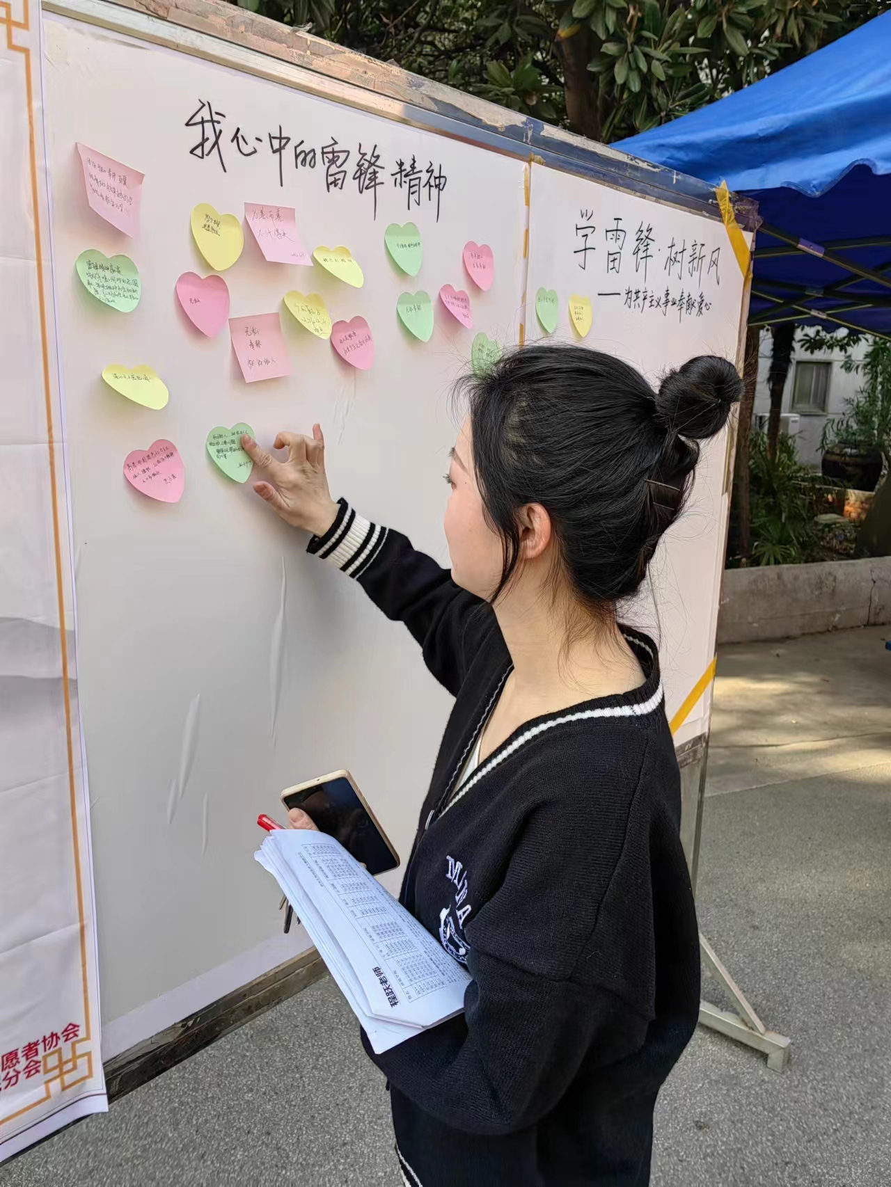 在“说出我心中的雷锋精神”活动中,同学们纷纷写下自己心目中所理解的雷锋精神,抒发自己对雷锋精神在新时代的丰富内涵。同学们都表示要以身边的“雷锋”为榜样,从小处着手、从点滴做起,践行社会主义核心价值观。活动中,志愿者们积极热情、齐心协力,弘扬了奉献友爱、互助进步的志愿服务精神,展现了我院学子朝气蓬勃、奋发有为的精神风貌。