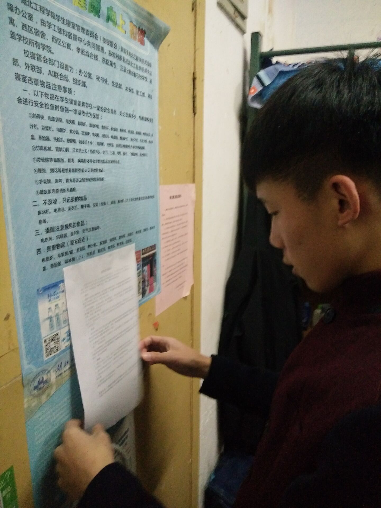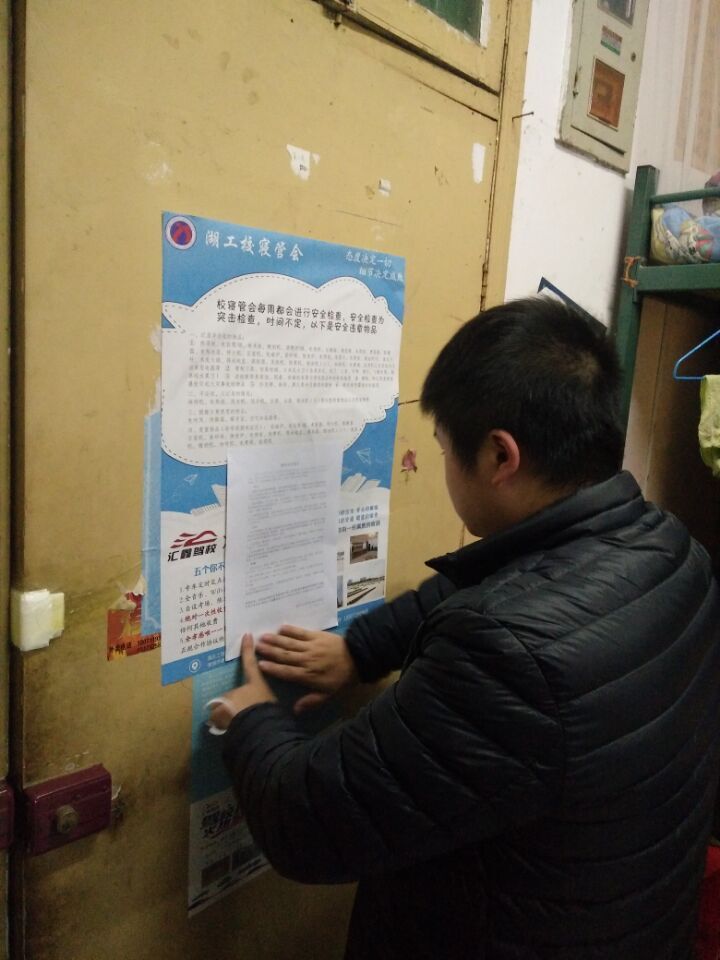 为了增强我院学生的防火防盗防骗意识和能力,杜绝火灾、偷盗、诈骗事件的发生,2017年12月7日晚18:00,我院学工办老师组织全体寝管干部深入每个寝室,张贴寝室安全提示单,开展寝室安全宣传教育。