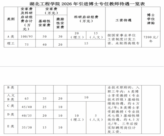 引进博士研究生待遇按下列标准提供基本安家费和科研启动经费(高层次人才的相关待遇和支持条件采取“一人一策、一事一议”,详细信息请登录“williamhill英国官网”(http://www.hbeu.cn)-《williamhill英国2026年面向社会专项公开招聘工作人员公告》和《williamhill英国 2026 年人才待遇标准》。